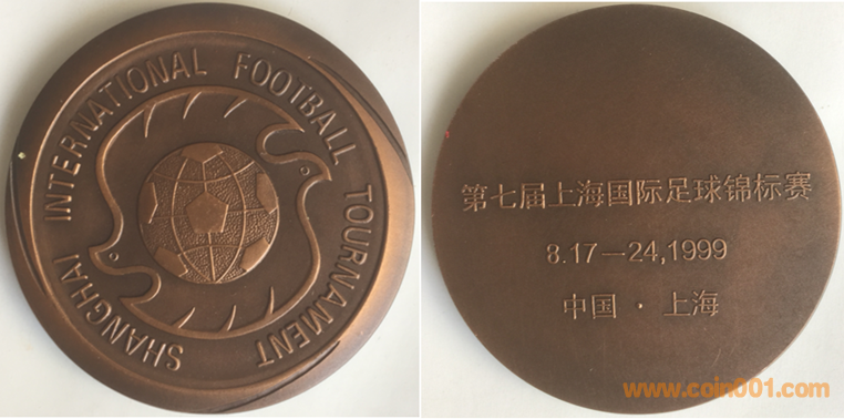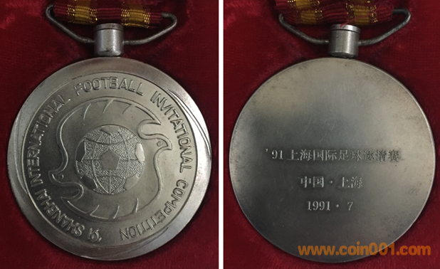1991年上幣制造,紫銅鍍金普制(第一名)。紫銅鍍銀普制(第二名),紫銅上色(第三名)。三種版別均為60MM。正面為足球,反面為主題文字。(發(fā)行量52枚)